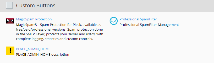 SECTION_ADMIN_TOOLS_MAIL- Mail sectionSECTION_ADMIN_TOOLS_PLESK- Plesk sectionSECTION_ADMIN_TOOLS_GENERAL- General Settings sectionSECTION_ADMIN_TOOLS_SECURITY- Security sectionSECTION_ADMIN_TOOLS_APPEARANCE- Plesk Appearance sectionSECTION_ADMIN_TOOLS_STATISTICS- Statistics sectionSECTION_ADMIN_TOOLS_APPS_AND_DBS- Applications & Databases sectionSECTION_ADMIN_TOOLS_EXTERNAL_SERVICES- External Services sectionSECTION_ADMIN_TOOLS_SERVER_MANAGEMENT- Server Management sectionSECTION_ADMIN_TOOLS_ADDITIONAL_SERVICES- Additional Services sectionSECTION_ADMIN_TOOLS_TOOLS_AND_RESOURCES- Tools & Resources sectionSECTION_ADMIN_TOOLS_TROUBLESHOOTING_BUTTONS- Assistance and Troubleshooting section