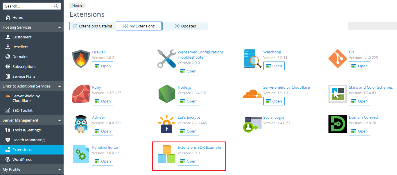 As a result, the new extension will be displayed in the list of extensions on the Extensions page of the Plesk user interface:
