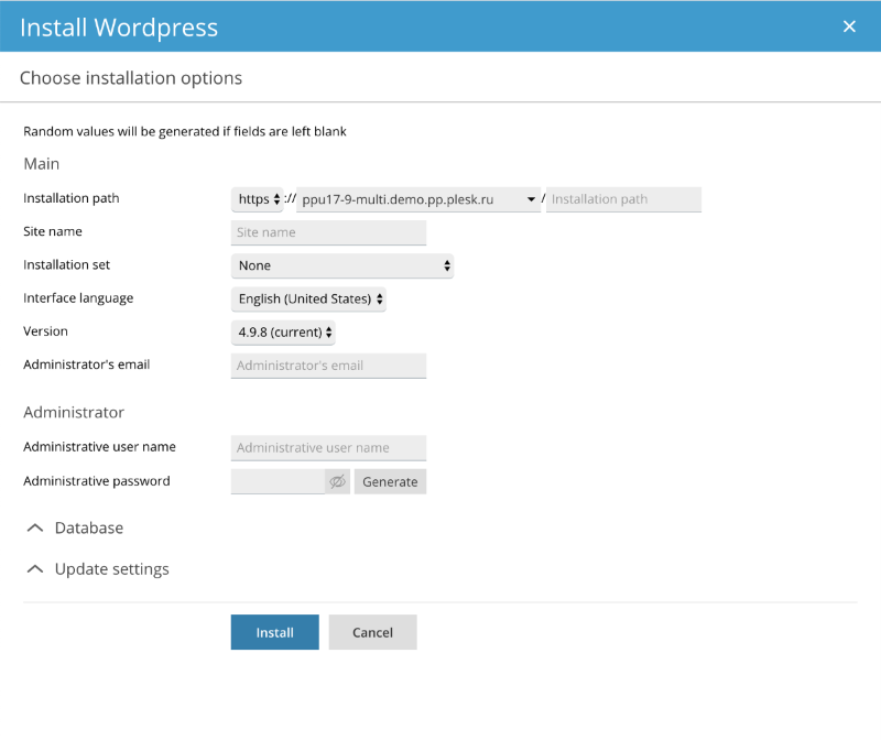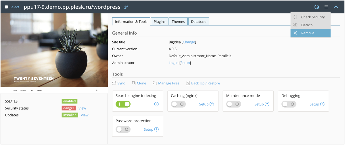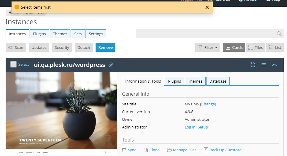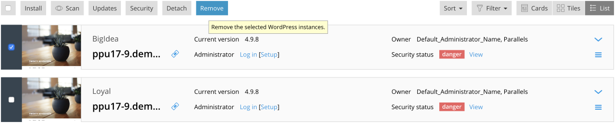 Alternatively, an object can be created from a file that has been downloaded to the operating system or in some other way so that Plesk is not immediately aware of it. For example, Scan function for WordPress that searches the server for instances. In such a case, an object is added from the search results.