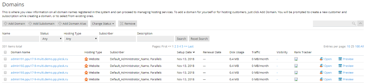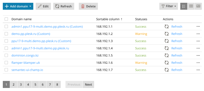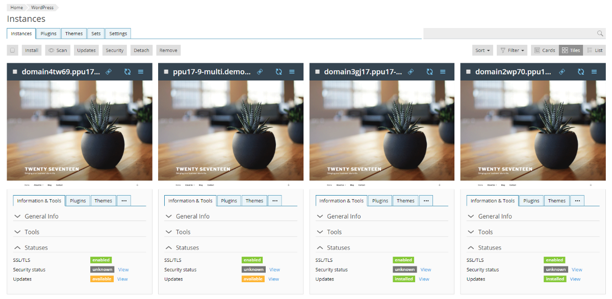 The objects in the card lists are displayed in the form of cards, which include screenshots or previews and unique sets of tools. This display mode is suitable for objects like web sites, WordPress instances, etc.