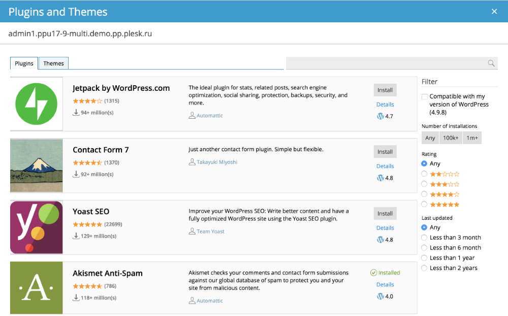 When a large amount of data needs to be filtered by multiple parameters, a filter panel can be created. Such a panel can be a part of the screen containing the list as can be seen on the WordPress Plugins and Themes window.